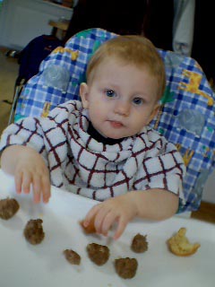 ![]() Mmmmm, meatballs. (Alex's first two molars are coming in, so he can chew quite a few "big people" foods now). |
