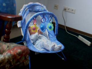 ![]() Alex has been starting to notice the toys dangling from his bouncy seat. |
