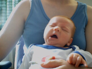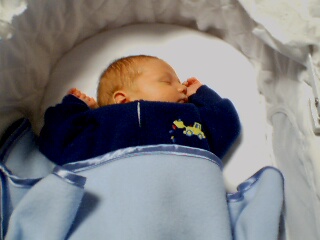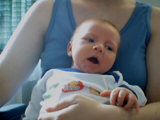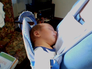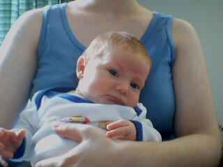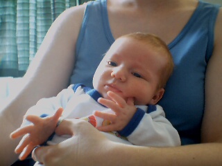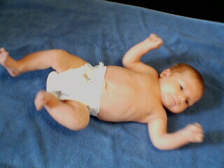One Month OldAlex weighs 10 lbs. now, and is already starting to grow out of some of his smaller clothes. The muscles in his neck are getting stronger each day, and he practices lifting his head up a lot. He likes taking baths, but hates having his hair and face washed. He still gets hungry about every two hours, but is much better about going right back to sleep after eating during the nights. He tends to have a "fussy time" in the evenings, though -- not quite colic, but he does get to crying pretty hard at times. Jiggling up and down and running the vacuum cleaner seem to work fairly well to calm him. ![]() "Look, Ma! I'm wearing a bigger size diaper now!" |