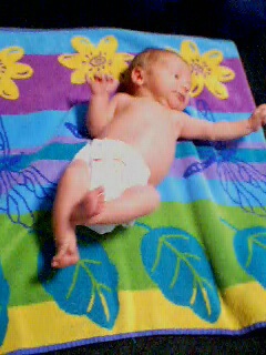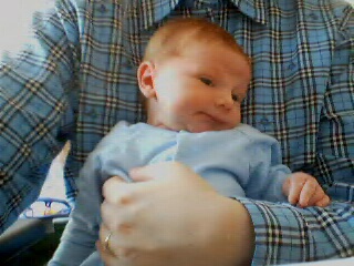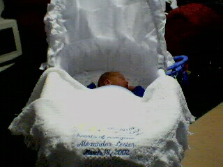 ![]() Relaxing in his new vibrating bassinet, with blanket sent by Joe and Michelle (embroidered with his name and birthdate!). |