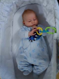 ![]() Alex relaxes in his bassinet, playing with his links. |