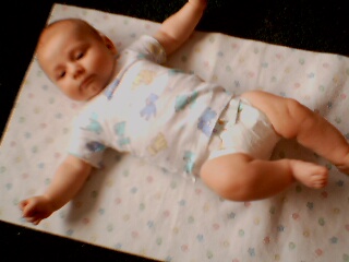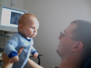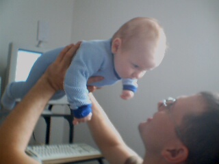 Three Months Old(Special Father's Day Edition)Alex has doubled his birth weight and checks in at slightly over 15 lbs now. He's still pleasantly plump, but most of his new weight gain has come from him growing in length. He has an incredibly long torso and has grown out of several outfits because they simply wouldn't stretch to snap under his diaper anymore. He's also developed a few bald spots on the front and sides of his head, but the hair appears to be growing back in a strawberry blond color. |