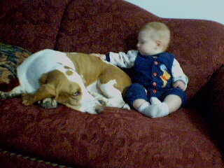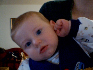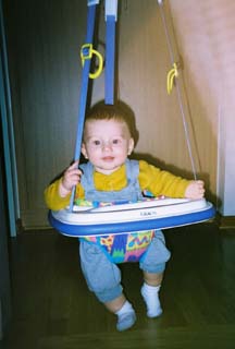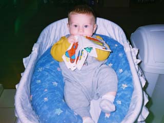 Six Months OldHe's got teeth! Alex has sprouted two little chompers on his lower gum, and a third one is in sight. He has a bit of discomfort with them, but Orajel, frozen washcloths and teething toys seem to help. Speaking of putting things in his mouth, he has also been experimenting with his first solid food, mashed bananas. Generally, he eats about a 1/4 teaspoon of it and then smears the rest into his hair. He absolutely insists on holding his own spoon, though. |