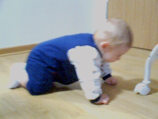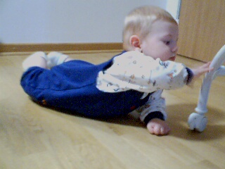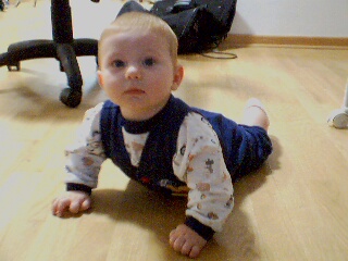 ![]() He's working so hard at crawling! Alex pulls himself up to this position, but then flops back down on his belly after a few seconds. |