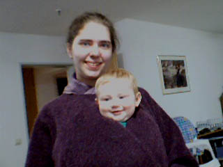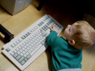 |  Traveling in style -- strapped into his frontpack and tucked inside Leanne's cloak. |  Alex has been so fascinated with our computers that we finally gave him his own keyboard and mouse (with the cords removed, of course). |