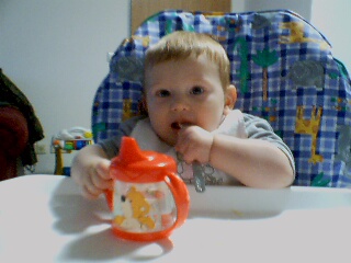 |  "Hey, Mama, watcha got in your hand?" |  Alex gets acquainted with his new spoon and sippy cup. |