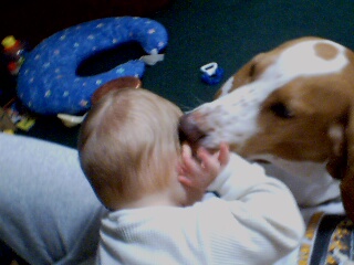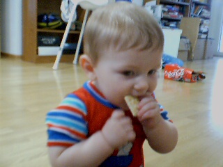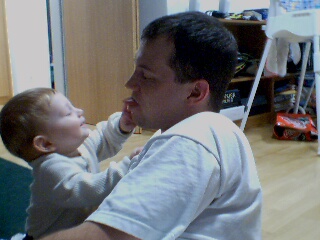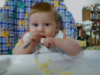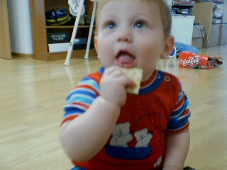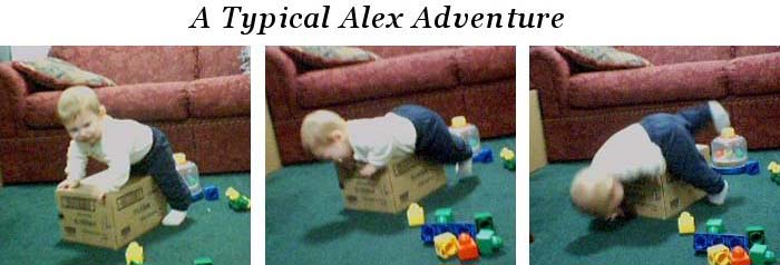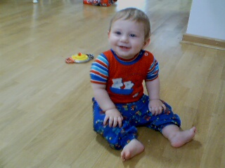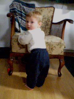 Eight Months OldAlex has been working so hard at standing this month. He pulls himself up on large toys, boxes, furniture or anything else he can find. Most of the time, he supports himself quite well on his wobbly little feet. Several times, though, he's gone completely over backwards and knocked his head on the hard floor, but seems none the worse for wear. He's also becoming much more verbal and in the mornings we're treated to long monologues of "oooooh, eeeeeee, goooooo" as he wakes up. |